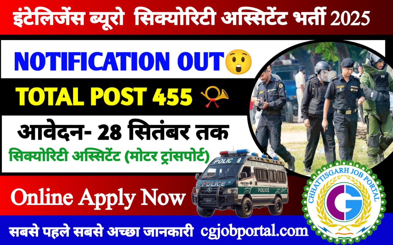 इंटेलिजेंस ब्यूरो (IB) ने सिक्योरिटी असिस्टेंट (मोटर ट्रांसपोर्ट) के 455 पदों पर भर्ती के लिए अधिसूचना जारी की है। यह भर्ती 10वीं पास उम्मीदवारों के लिए एक बड़ा अवसर है।